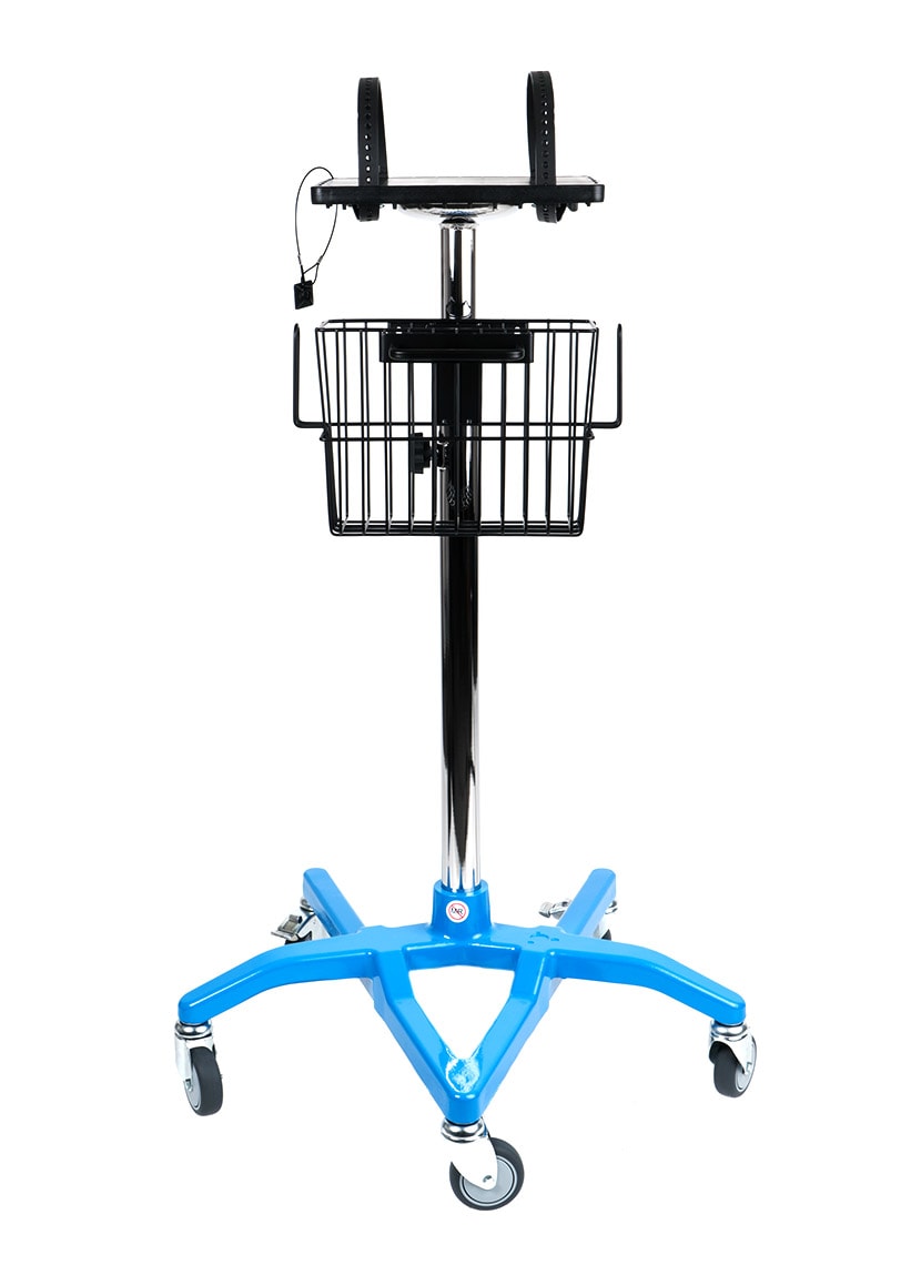The universal SmartStack equipment stand features a robust universal mounting plate, compatible with most CPAP and SiPAP units. Its cast aluminum base is specifically engineered for enhanced support and durability. The patented interlocking design allows the base to nest seamlessly with other SmartStack bases, making it easy to transport and store. Additionally, the stand comes with a pole-mounted basket for convenient extra storage.